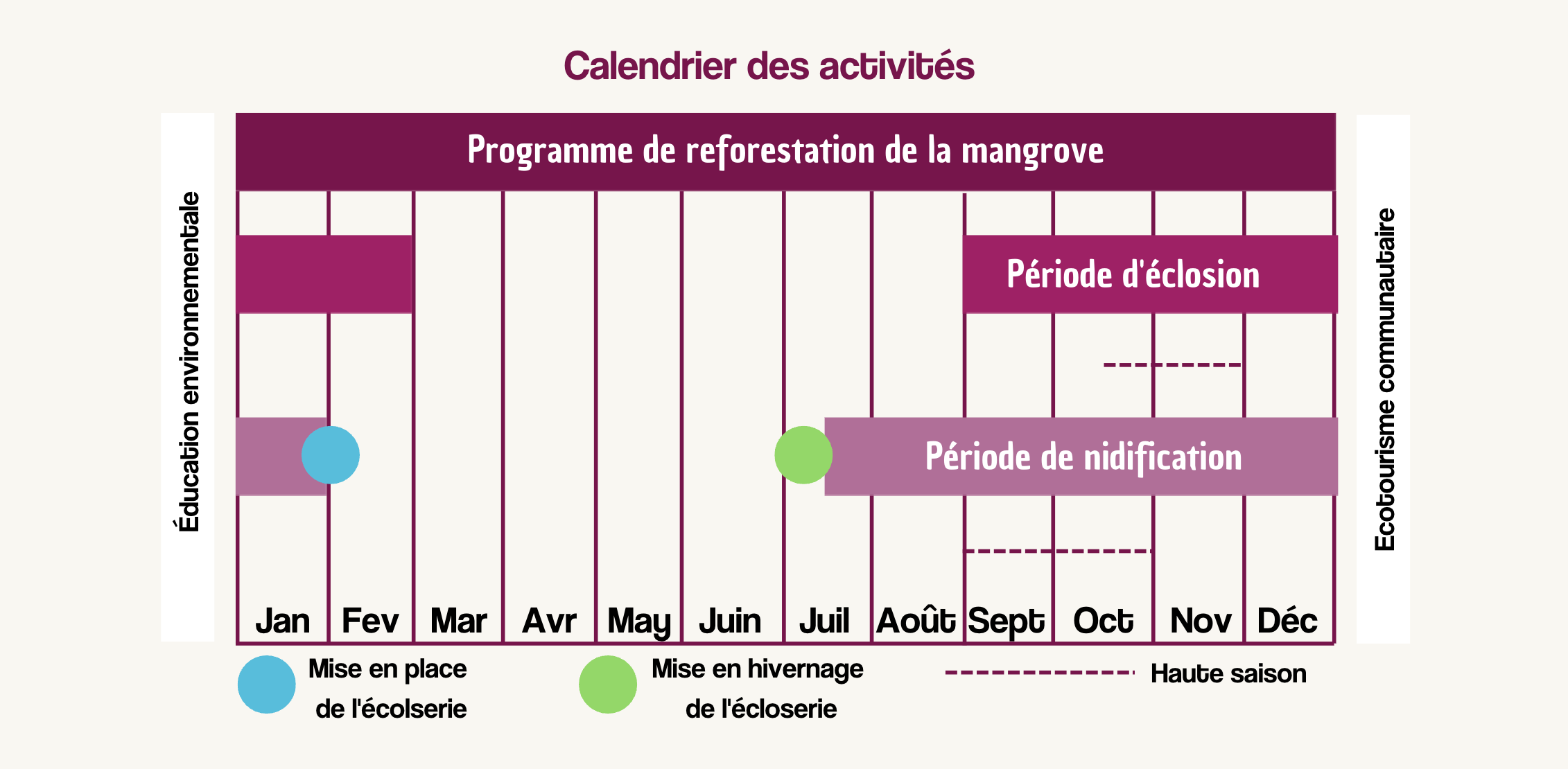 Certaines activités varient en fonction des saisons : Vous trouverez le calendrier des activités dans l'onglet "Photos". Dû à la migration des tortues, ce projet est possible de début aout à fin janvier.